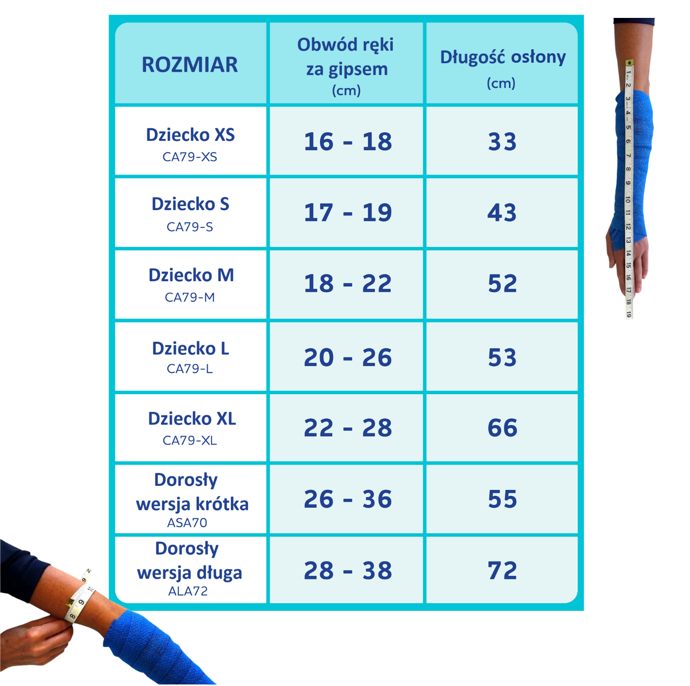 Wodoodporna osłona może być wykorzystywana zarówno przez dzieci, jak i dorosłych. W przypadku wersji dorosłej konieczne jest dobranie odpowiedniej wersji (długiej lub krótkiej) na podstawie długości gipsu (opatrunku) i obwodu ok. 2,5 cm za nim. W wersji dziecięcej konieczne jest dobranie odpowiedniego rozmiaru adekwatnego do wieku, ale kluczowe znaczenie ma długość gipsu (opatrunku) i obwód ok. 2,5 cm za nim.