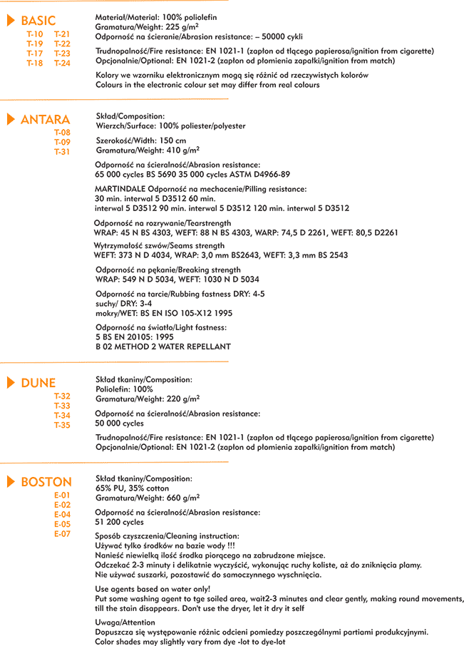 odporność na przecieranie 110 000 cykli ,atest higieniczny, ocena zapalności , próba papierosa i zapałki