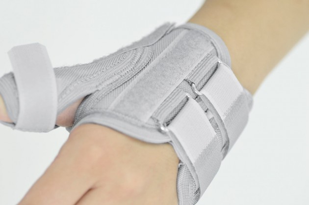Metalowa szyna stabilizuje cały staw śródręczno-paliczkowy i zapobiega nagłemu odwiedzeniu i przeprostowi kciuka.