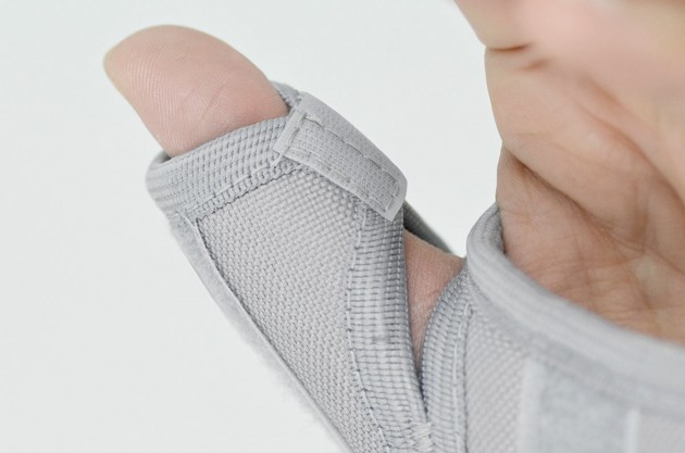 Ponadto, w ortezie zainstalowano elastyczne fiszbiny z tworzywa sztucznego oraz metalową szynę usztywniającą kciuk. Zaprojektowano w niej otwartą osłonę kciuka, dzięki czemu ortezę łatwiej się zakłada, a zapięcie rzepowe pozwala lepiej ją dopasować. Zastosowane dwie taśmy Velcro, wyposażone w klamerki, pozwalają precyzyjnie ustabilizować wyrób na dłoni. Zapięcia zostały tak skonstruowane, aby można było po dokładnym dopasowaniu wyrobu odciąć ich zbędną część.