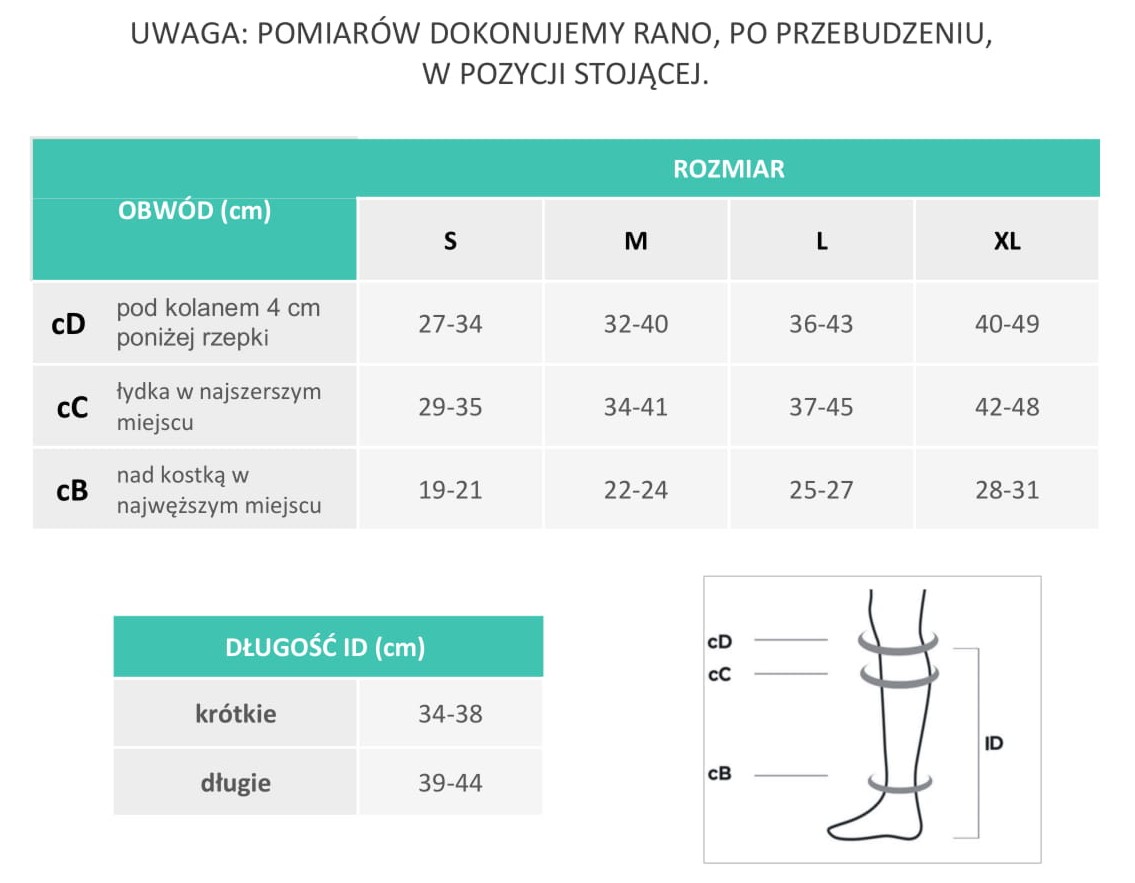 W celu prawidłowego dopasowania rozmiaru należy dokonać pomiarów obwodów obu nóg, w pozycji stojącej, w miejscach wskazanych w tabeli, a następnie wybrać rozmiar. Pomiarów należy dokonywać na nieobrzękniętej kończynie. Dopasowanie stopnia ucisku ma bardzo duże znaczenie. Nie może on być zbyt delikatny, ponieważ będzie nieskuteczny. Z kolei zbyt silny ucisk może spowodować upośledzenie przepływu krwi w tętnicach kończyn dolnych.